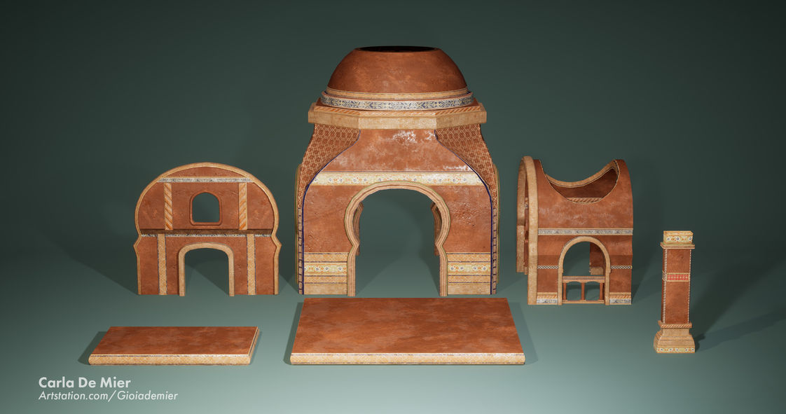 For this Modular Kit I was particularly inspired by "La Iglesia del Convento de San Agustin de Belchite". This ruin has maintained so many beautiful details intact over the years, and I was inspired by how they translated the church's style to match the arid desert environment. Working off of that we have this cathedral built out at sea. I imagine the island it sits on was much bigger when it was built, but erosion has left it in the state we see today. Foliage is from the Unreal Marketplace. I used a combination of Substance Painter and Designer to create my textures.